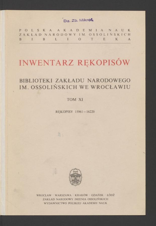 | Inwentarz rękopisów Biblioteki Zakładu Narodowego im. Ossolińskich we Wrocławiu. Tom 11, Rękopisy 15961-16220 | Sep 11, 2025 |